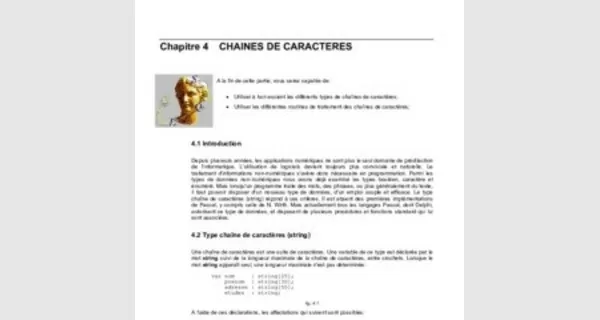 Depuis plusieurs années, les applications numériques ne sont plus le seul domaine de prédilection de l'informatique. L'utilisation de logiciels devient toujours plus conviviale et naturelle. Le traitement d'informations non-numériques s'avère donc nécessaire en programmation. Parmi les types de données non-numériques nous avons déjà examiné les types booléen, caractère et énuméré. Mais lorsqu'un programme traite des mots, des phrases, ou plus généralement du texte, il faut pouvoir disposer d'un nouveau type de données, d'un emploi souple et efficace. Le type chaîne de caractères (string) répond à ces critères. Il est absent des premières implémentations de Pascal, y compris celle de N. Wirth. Mais actuellement tous les langages Pascal, dont Delphi, autorisent ce type de données, et disposent de plusieurs procédures et fonctions standard qui lui sont associées.
