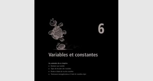 où NomVariable est le nom de la v ariable, qui sera utilisé par la suite pour y f aire réfé- rence, et Type le type de données qu’accepte la v ariable — présentés dans la section suivante. L’argument Type est f acultatif, mais la déclaration d’un type de v ariable peut vous faire économiser de l’espace mémoire et améliorer ainsi les performances de v otre programme. Lors de la déclaration de v ariables, une variable de type String prend pour valeur une chaîne vide, une variable numérique prend la valeur 0.