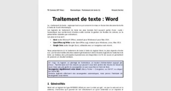 Nous présenterons ici le traitement de texte à l'aide du logiciel Word, le plus répandu d'entre eux. Les fonctionnalités décrites existent généralement dans d'autres logiciels de traitement de texte (un tableau des principales équivalences est disponible à la fin de cours) et permettent de produire un résultat similaire.