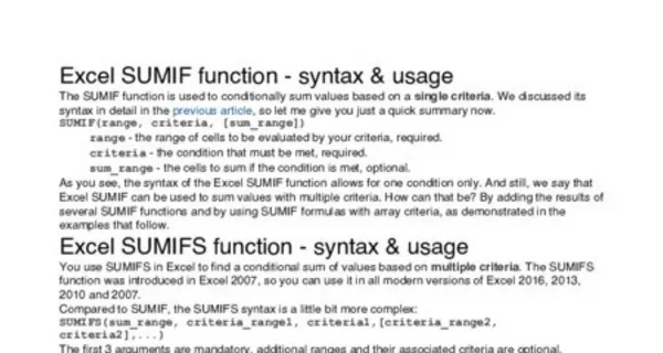 You use SUMIFS in Excel to find a conditional sum of values based on multiple criteria. The SUMIFS function was introduced in Excel 2007, so you can use it in all modern versions of Excel 2016, 2013, 2010 and 2007.