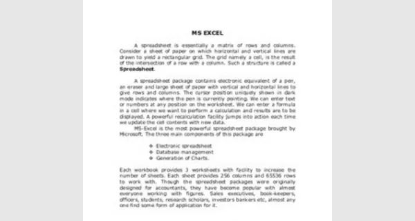 Each workbook provides 3 worksheets with facility to increase the number of sheets. Each sheet provides 256 columns and 65536 rows to work with. Though the spreadsheet packages were originally designed for accountants, they have become popular with almost everyone working with figures. Sales executives, book-keepers, officers, students, research scholars, investors bankers etc, almost any one find some form of application for it.