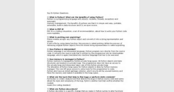 memory management. The benefits of pythons are that it is simple and easy, portable, extensible, build-in data structure and it is an open source.