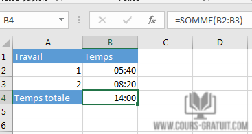 Si nous souhaitons calculer le temps total mis par un élève pour effectuer deux travaux différents, l’élève peut terminer le premier travail en 5 heures et 40 minutes et le second en 8 heures et 20 minutes, pour calculer la somme nous allons utiliser la formule ci-dessous :