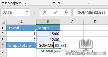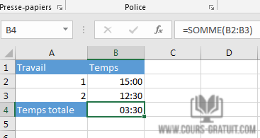 Maintenant, disons que dans l’exemple ci-dessus, nous souhaitons ajouter plus de 24 heures. Le temps nécessaire à l’étudiant pour terminer le premier travail est de 15 heures et le temps nécessaire pour terminer le deuxième travail est de 12 heures et 30 minutes, pour calculer la somme nous avons utilisé la formule suivante :