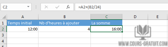 Nous pouvons voir que la cellule A2 contient une heure initiale et que le nombre d’heures que nous souhaitons ajouter est contenu dans la cellule B2. Maintenant, cette addition de temps se fait comme suit :