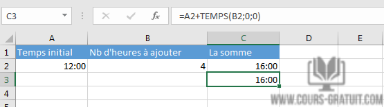 Nous voyons donc que nous obtenons le même résultat en utilisant également la fonction TEMPS(). Cependant, la fonction TEMPS() ne peut être utilisée de cette manière que si on souhaite ajouter moins de 24 heures.