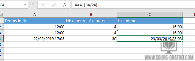 Nous pouvons voir que la cellule A4 contient une Date et heure initiale et que le nombre d’heures que nous souhaitons ajouter est contenu dans la cellule B4. Maintenant, cette addition de deux valeurs de temps se fait comme suit :