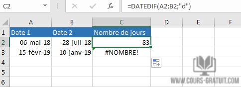 Le résultat est un entier qui représente le nombre de jours entre les deux dates dans les deux cellules :
