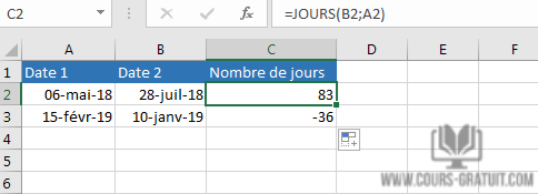 =JOURS(B2 ; A2)