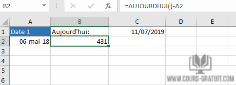 À titre d'exemple, calculons la différence entre aujourd'hui et une date antérieure en A2. Pour cela nous allons utilisez la formule suivante :