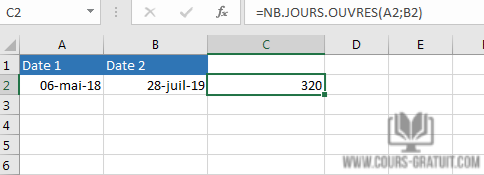 NB.JOURS.OUVRES (date_début ; date_fin ; [jours fériés])