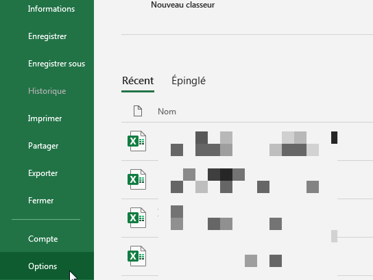 - Accédez à l'onglet « Fichier» puis cliquez sur la commande « Options » dans la barre latérale gauche. La boite de dialogue « Options Excel » s’ouvre. Cliquez sur la commande « Personnaliser le ruban » sur le côté gauche. Alternativement, faites un clic droit sur le ruban et sélectionnez « Personnaliser le ruban » :