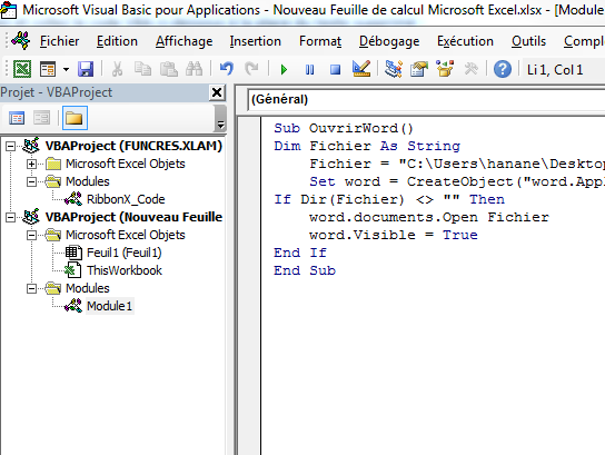 Remarque : dans le code VBA ci-dessus, remplacez le chemin « C:\Users\hanane\Desktop\Exemple.docx » par le chemin du document Word que vous souhaitez ouvrir automatiquement dans Excel.