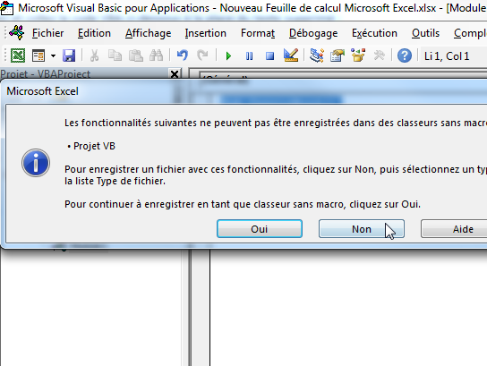 Cliquez sur le bouton « Enregistrer » dans la barre d'outils de l'éditeur VB. Dans la boite de dialogue qui s’ouvre, cliquez sur « Non » :