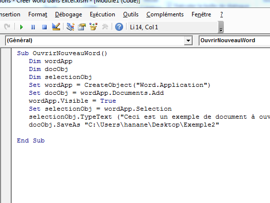 - docObj.SaveAs "C:\Users\hanane\Desktop\Exemple2" : sauvegarde le document.