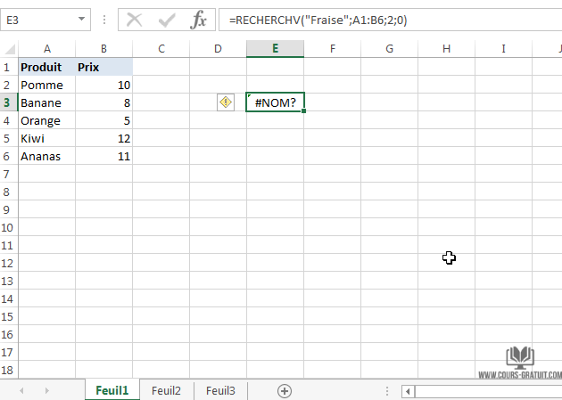 Par exemple, si au lieu de RECHERCHEV, vous écrivez par erreur RECHERCHV, cela donnera une erreur de nom.