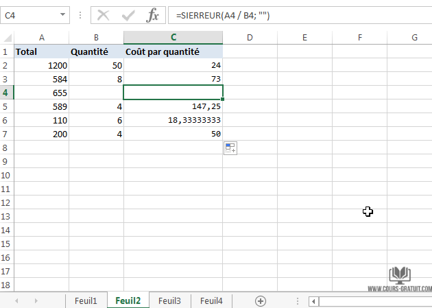 C'est ce qu'on appelle l'erreur de division. Dans l'exemple ci-dessous, la formule A4/B4 donne # DIV / 0! car la valeur de la quantité (le diviseur dans la formule) est 0.