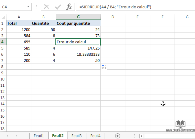 =SIERREUR(A2 / B2; "Erreur de calcul")