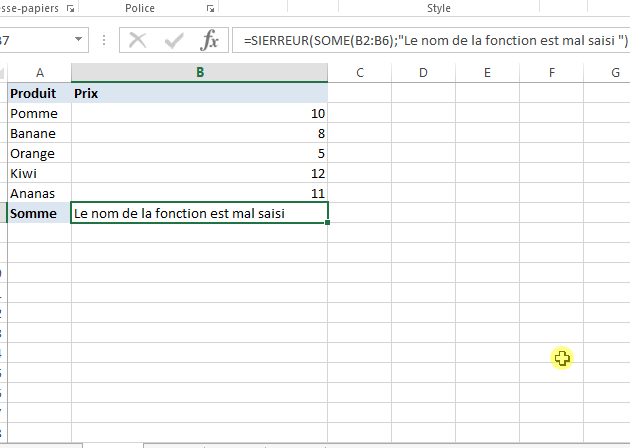 Au lieu de SOMME, si l'utilisateur écrit la mauvaise formule, une erreur #NOM? sera générée.