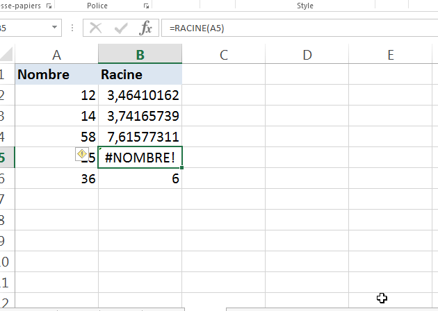 Une autre situation où vous pouvez obtenir l'erreur NOMBRE est lorsque vous donnez un argument numérique non valide à une formule. Par exemple, si vous calculez la racine carrée d’un nombre et que vous donnez un nombre négatif comme argument, la formule renverra une erreur numérique.