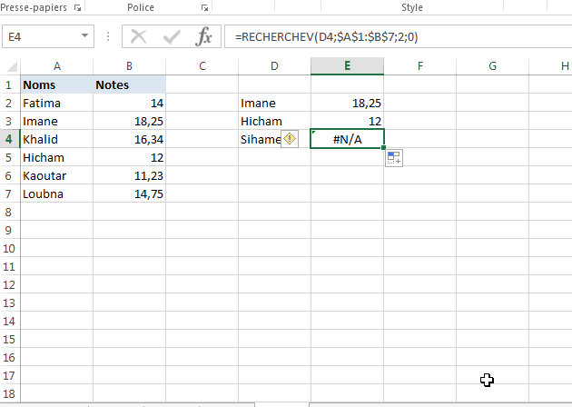 Bien que la formule RECHERCHEV dans cet exemple trouve les noms des deux premiers étudiants, elle ne trouve pas le nom de « Sihame » dans la liste et renvoie donc l'erreur # N/A.