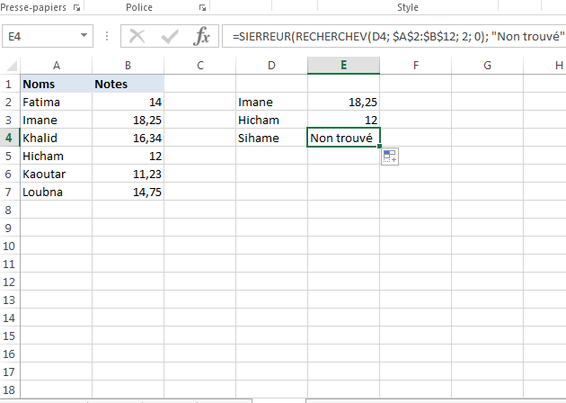 Dans ce cas, pour trouver la note de Loubna, vous devez utiliser la formule SIERREUR imbriquée suivante :