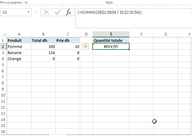 La formule fonctionne correctement tant que la plage de diviseurs ne contient pas de zéros ou de cellules vides. S'il y a au moins une valeur 0 ou une cellule vide, l’erreur #DIV/0! est renvoyée :