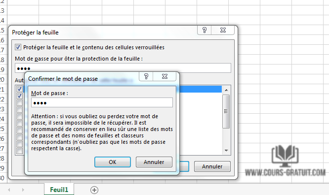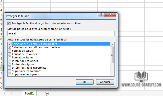 - Dans la fenêtre de dialogue « Protéger la feuille », procédez comme suit :