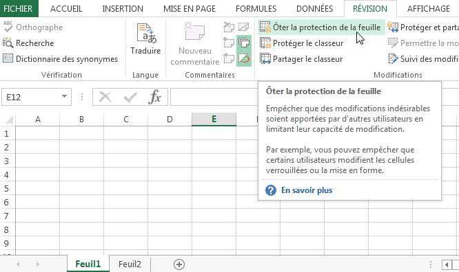 - Sous l'onglet « Révision », dans le groupe « Modifications », cliquez sur « Oter la protection de la feuille ».