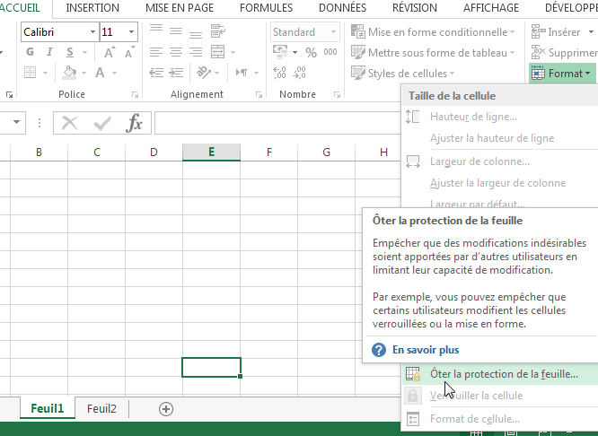 - Sous l'onglet « Accueil », dans le groupe « Cellules », cliquez sur Format et sélectionnez Oter la protection de la feuille dans le menu déroulant.