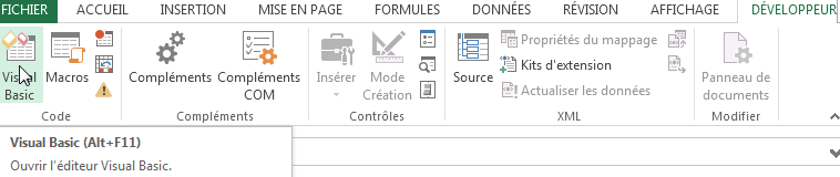 - Appuyez sur Alt + F11 pour ouvrir l'éditeur Visual Basic ou accédez à l’onglet Développeur» et cliquez sur le bouton Visual Basic à gauche du ruban.