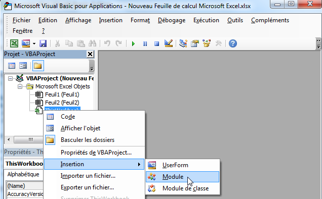 - Cliquez avec le bouton droit sur le nom du classeur dans le volet gauche et sélectionnez Insertion > Module dans le menu contextuel.