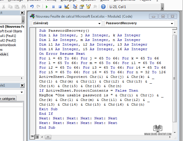 Dans les versions plus anciennes (sous Microsoft Excel 2010), la longueur et la complexité de votre mot de passe n'ont même pas d'importance. Quiconque possède au moins quelques connaissances de base de VBA peut le casser en quelques minutes (vous trouverez dans ce tutoriel un exemple du code VBA qui déchiffre facilement les mots de passe dans Excel 2010 et les versions inférieures).