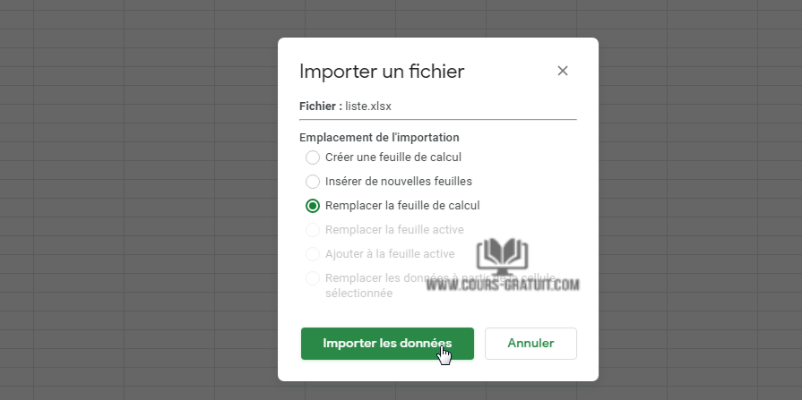 - Après avoir téléchargé votre feuille de calcul Excel, sélectionnez «Remplacer la feuille de calcul» et cliquez sur «Importer des données». La feuille Excel protégée s'ouvrira dans Google Sheets.