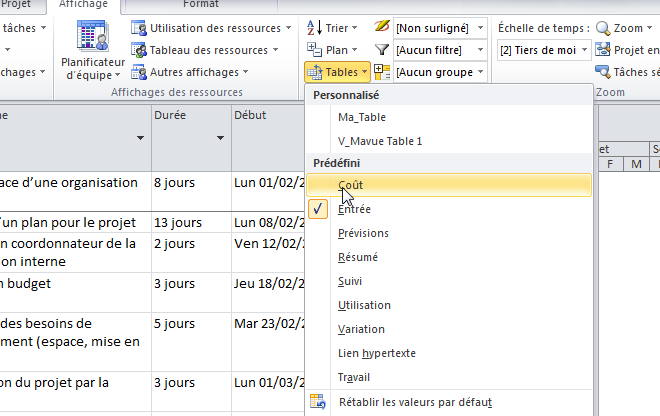 Avec Ms Project, vous pouvez également créer une nouvelle colonne et y afficher les coûts fixes. Pour réaliser ceci, vous devez d’abord passer de la table d’entrée à l’affichage de tableau des coûts. Vous pouvez le faire en accédant à l’onglet « Affichage » puis en cliquant sur le manu déroulant « Tables » dans le groupe « Données » et en sélectionnant « Coût » :
