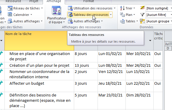 - Activez la vue « Tableau des ressources» en cliquant sur le bouton correspondant dans le groupe « Affichages de ressources » de l'onglet « Affichage » :