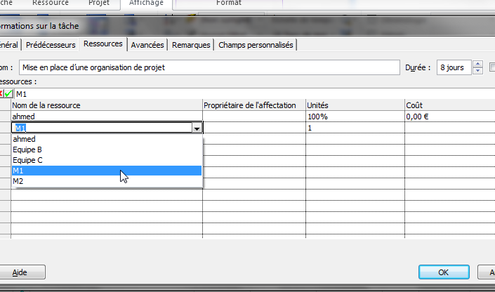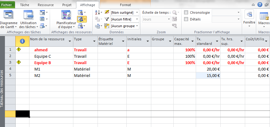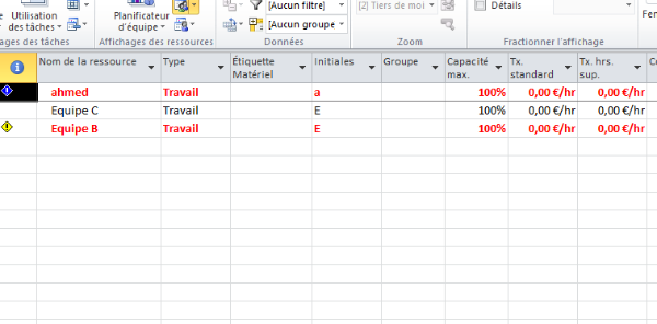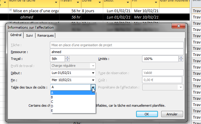 - Une fois la vue activée, faites un double clic sur la ressource affectée à la tâche dont vous souhaitez un taux de rémunération différent.