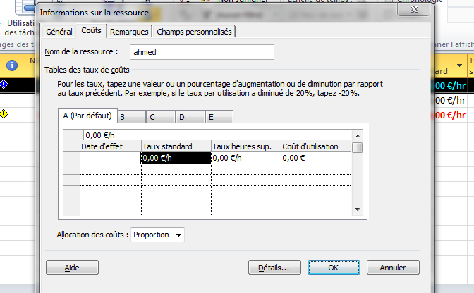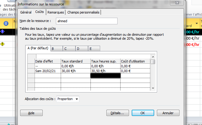 Dans Ms Project, vous pouvez affecter un taux de rémunération standard et un taux d'heures supplémentaires à chaque ressource de travail. Vous avez également la possibilité d’attribuer des taux de rémunération spécifiques pour un certain jour ou pour une affectation.