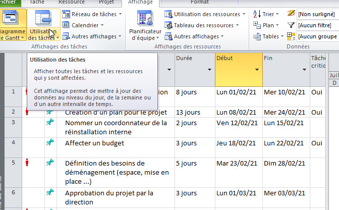 - Commencez d’abord par activer la vue « Utilisation des tâches» en cliquant sur le bouton correspondant dans le groupe « Affichages des tâches » de l'onglet « Affichage » :
