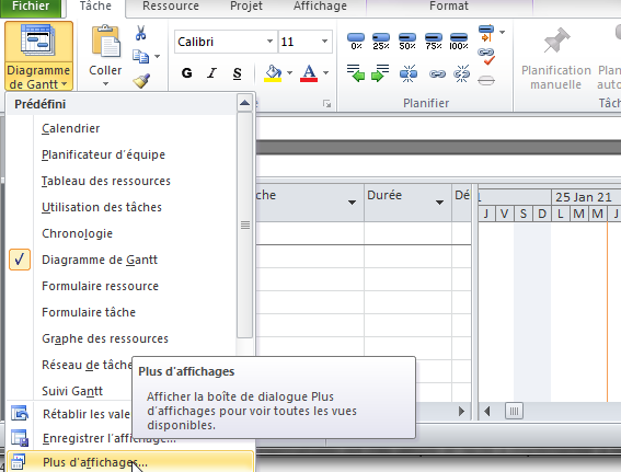 - Dans la liste déroulante qui s’affiche, notez que l’option « Diagramme de Gantt» est coché par défaut. Cliquez sur la dernière option « Plus d’affichages » :