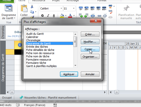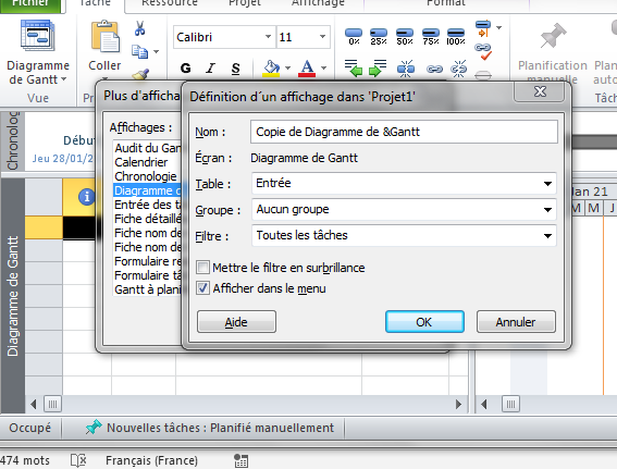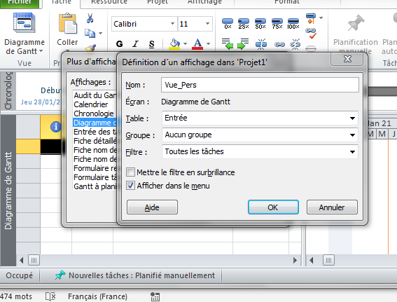 - Afin de pouvoir accéder à la vue personnalisée que vous créez à partir du menu « Diagramme Gantt» assurez-vous de cocher la case « Afficher dans le menu » et cliquez sur « OK » puis sur « Appliquer » pour terminer.
