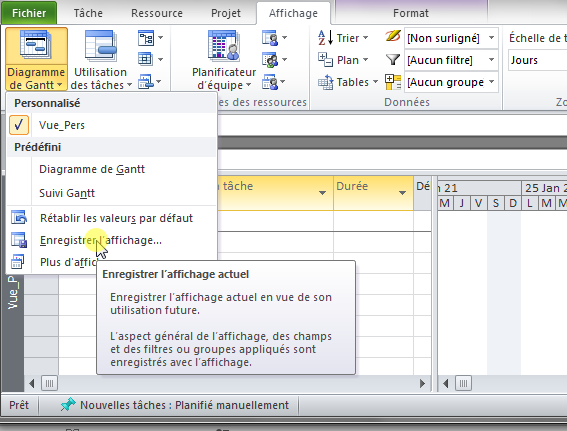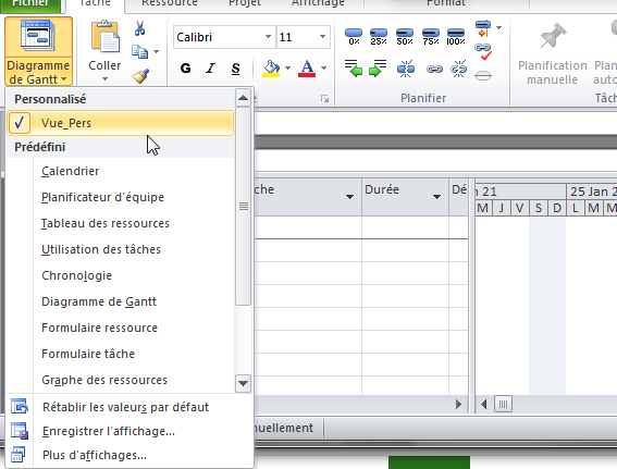- Vous constaterez que la vue nouvellement créée « Vue_Pers» apparaît maintenant dans la liste des vues « Personnalisé » en haut de la liste déroulante « Diagramme de Gantt » et vous pouvez utiliser cette vue à tout moment :
