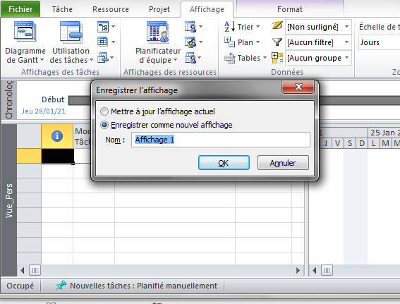 Le processus de création des vues personnalisées est très simple et facile à implémenter à mesure que vous l’ayez planifié à l'avance. Cette simplicité vient du fait que Ms Project nous donne la possibilité de modifier une vue intégrée, puis l'enregistrer en tant que vue personnalisée. Si vous voulez enregistrer une vue personnalisée à utiliser encore et encore, suivez les étapes ci-dessous :