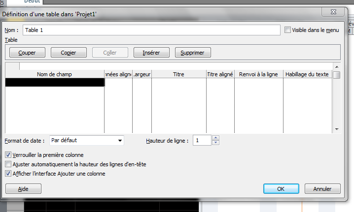 - Lorsque vous cliquez dessus la boite de dialogue « Définition d’une table dans ‘Nom de votre projet’» s’ouvre. Complétez les informations demandées. Commencez par taper un nom pour votre nouvelle table :