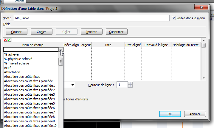 Remarque : Ms Project vous donne également la possibilité de créer vos propres champs personnalisés que vous pourrez ensuite ajouter aux tables existantes.