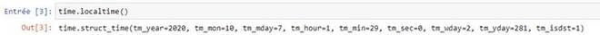 Comme mentionné ci-dessus, nous utiliserons la fonction localtime. Elle prend un argument le timestamp que nous avons trouvé ci-dessus. Si ce dernier n’est pas mentionné, localtime va utiliser d’une manière automatiqu time.time () pour renvoyer la date et l'heure du jour même.