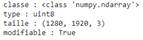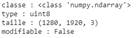 Remarquez que nous avons généré un vecteur de classe numpy.ndarray contenant des valeurs de type uint8 (entier) de 3 dimensions dont la forme est (hauteur, largeur, canal (Rouge, Vert, Bleu)). En plus, ce vecteur est modifiable (vous pouvez modifier les valeurs de chaque pixel). Si vous souhaitez créer un vecteur numpy non modifiable pour conserver par exemple votre image principale vous pouvez utiliser la commande np.asarray() :