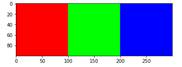 Remplissons maintenant le vecteur numpy avec des pixels de couleur rouge (rouge = 255, vert = 0, bleu = 0), vert (rouge = 0, vert = 255, bleu = 0) et bleu (rouge = 0, vert = 0, bleu = 255). Pour réaliser cette tâche, nous décomposons notre vecteur en trois tranches. Les trois valeurs de chaque couleur sont diffusées sur toutes les lignes et colonnes de chaque tranche : la première tranche sera en rouge, la deuxième en vert et la troisième en bleu :