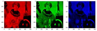 En mode RGB, Chaque pixel de l'image est représenté par trois entiers. Pour diviser l'image en composantes de couleur distinctes et générer des images monochromes (un seul canal), il suffit de garder un seul canal (Rouge, Vert ou bleu) et mettre les deux autres valeurs à 0. Si vous ne voulez garder que le canal rouge, le script est le suivant :