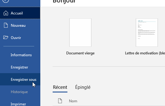 - Ouvrez le menu « Fichier» et cliquez sur « Enregistrer sous » dans la barre latérale gauche :